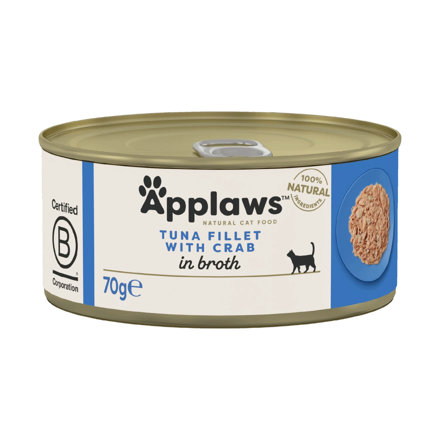 Applaws Cat Tuna Fillet & Crab ist in Dosen mit 70 g Inhalt erhältlich.