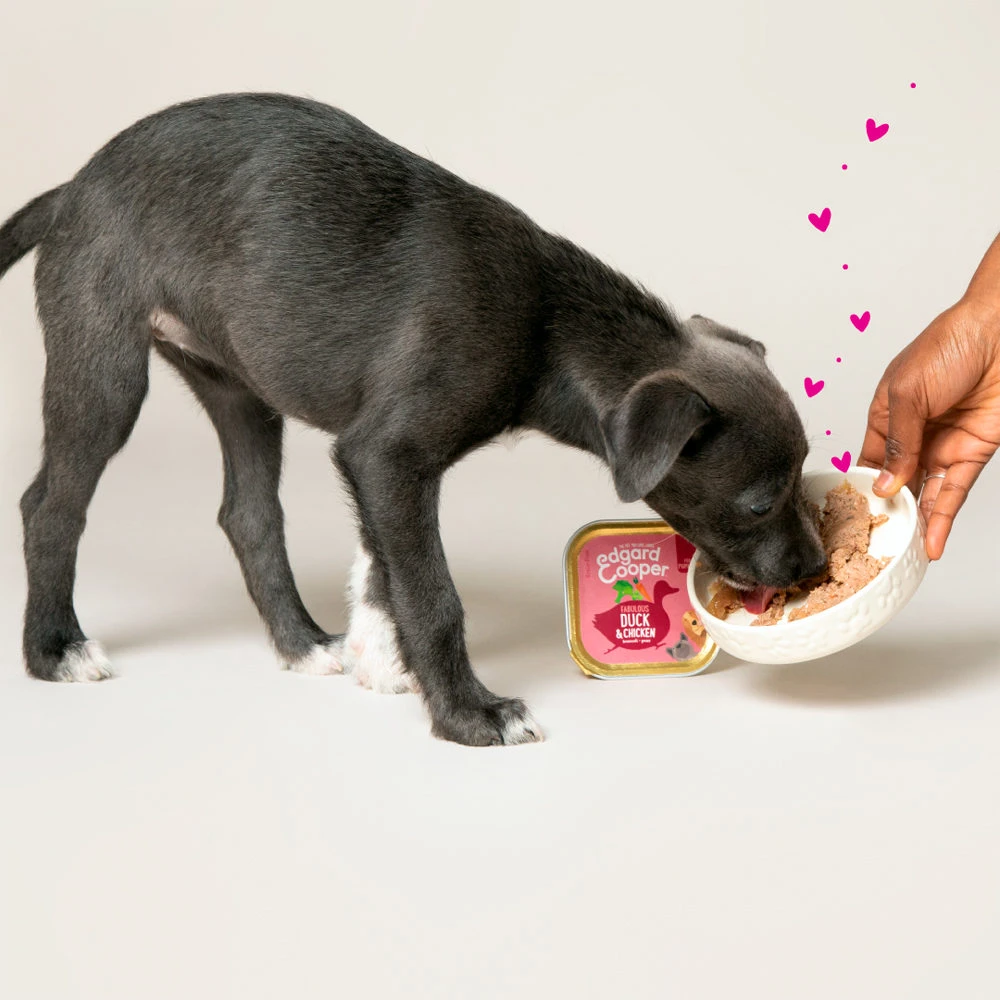Das Welpenfutter Edgard & Cooper Puppy – Ente & Hühnchen – in Schälchen ist auch als Trockenfutter mit schmackhaften Hundebrocken erhältlich.