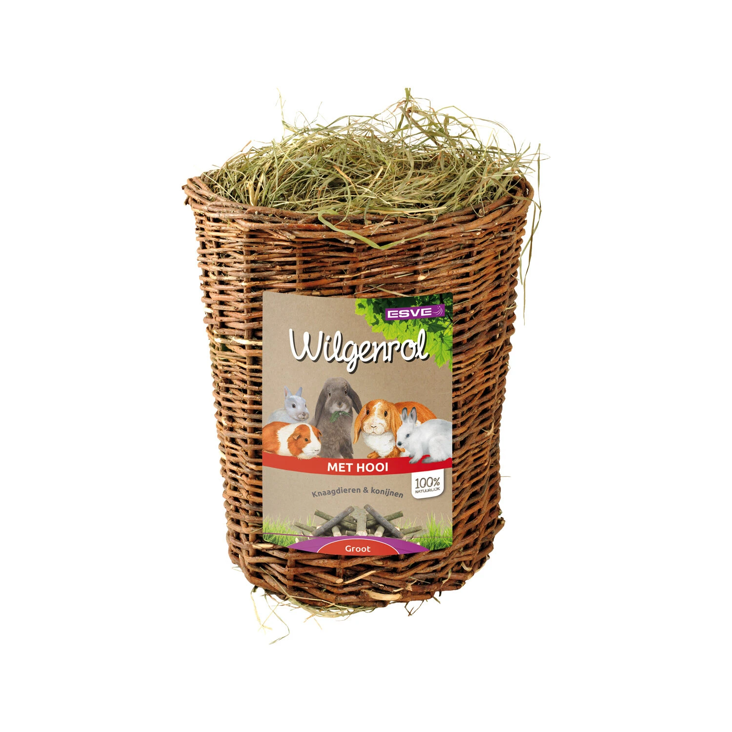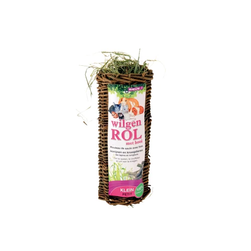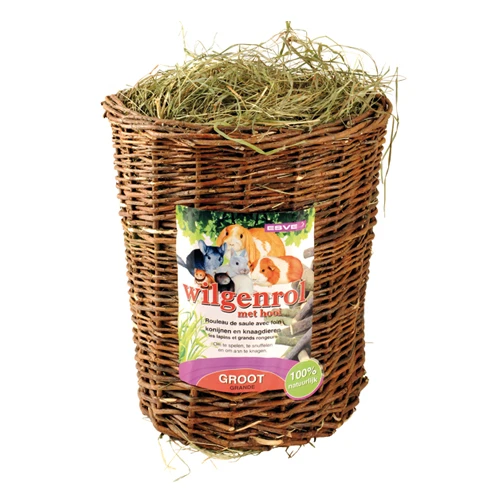 Die Weidenrolle von Esve ist ein Naturprodukt für Kaninchen und Nagetiere. Die Rolle ist aus Weidenholz geflochten und mit schmackhaftem Heu gefüllt. Ihr Haustier kann an der Weidenrolle nagen, schnuppern, knabbern und mit ihr spielen. Ideal für jedes Kaninchen oder Nagetier, beispielsweise um Langeweile zu verhindern.