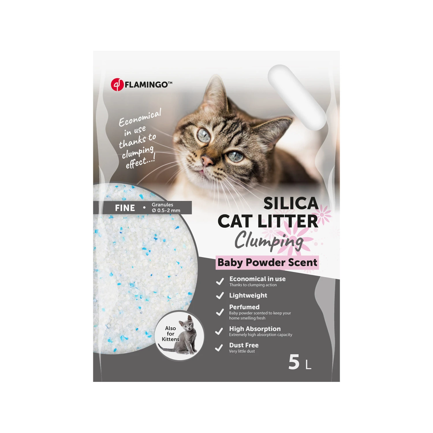 Die Flamingo Katzenstreu Silica vereint Komfort und Hygiene in einem Produkt. Die feinen Körner sind sanft zu den Pfoten Ihrer Katze und eignen sich auch für Kätzchen. Dank der schnellen Absorption von Urin und der Zugabe eines subtilen Babypuderdufts werden unangenehme Gerüche sofort neutralisiert. Das Streu bildet feste Klumpen, was Ihnen das Reinigen der Katzentoilette erleichtert. Zudem ist es staubarm und sparsam im Gebrauch, was sowohl für Sie als auch für Ihre Katze angenehm ist.