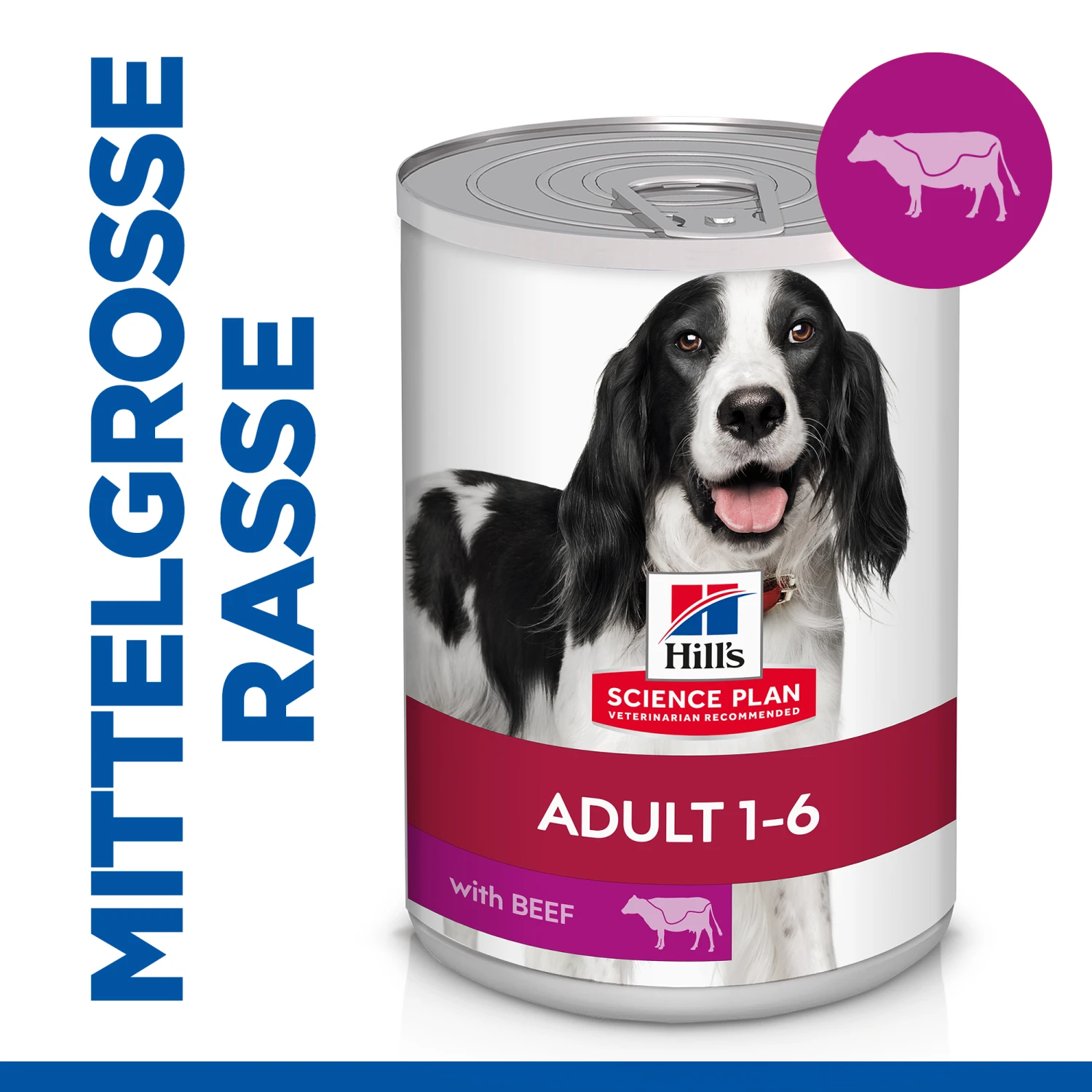 Hill’s Science Plan – Canine Adult – Beef ist in Dosen mit je 370 g Inhalt erhältlich.