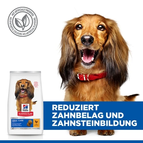 Hill’s Science Plan Canine Adult Oral Care mit Huhn und Antioxidantien und einer hoch entwickelten Zahnpflege-Technologie reduziert nachweislich, durch klinische Studien bewiesen, Zahnbelag und Zahnstein.