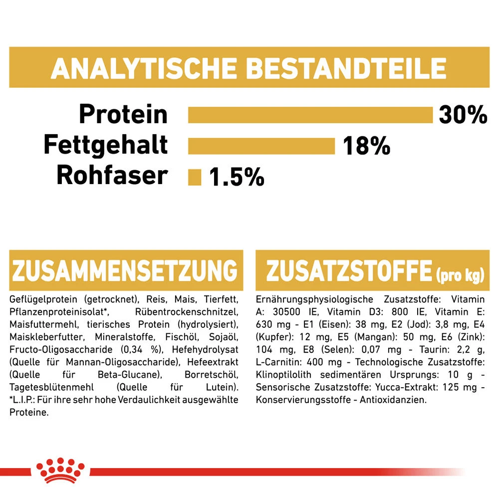 Getrocknetes Geflügelprotein, Reis, Mais, tierisches Fett, Isolat von pflanzlichen Proteinen (L.I.P.: Leicht verdauliche Proteine), Rübentrockenschnitzel, Maisfuttermehl, Maiskleberfutter, hydrolysiertes tierisches Protein, Mineralien, Fischöl, Sojaöl, Fructooligosaccharide, Hefehydrolysat (Quelle für Mannan-Oligosaccharide), Borretschöl und Tagetesblütenmehl (Quelle für Lutein). Ernährungsphysiologische Zusatzstoffe: Vitamin A (30500 IE/kg), Vitamin D3 (800 IE/kg), E1 Eisen (47 mg), E2 Jod (4,7 mg), E4 Kupfer (9 mg/kg), E5 Mangan (61 mg/kg), E6 Zink (183 mg/kg), E8 Selen (0,08 mg/kg), Taurin (2,1 g/kg), L-Carnitin (400 mg/kg). Technologische Zusatzstoffe: Pentanatriumtriphosphat (3,5 g/kg), Konservierungsstoffe, Antioxidantien.