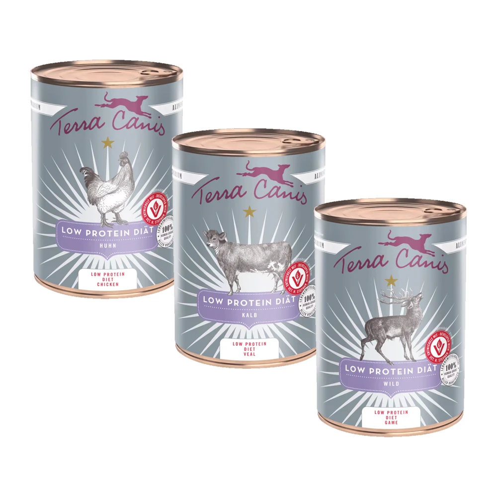 Terra Canis AliVet Low Protein ist ein vollständiges Hundefutter, das sorgfältig für Hunde mit eingeschränkter Nierenfunktion entwickelt wurde. Das Futter enthält ausschließlich Zutaten von 100% Qualität und wurde in Zusammenarbeit mit Tierärzten entwickelt. Mit einem niedrigen und gut verdaulichen Proteingehalt, moderatem Fett und erhöhten Fasern hilft dieses Futter, den Stoffwechsel Ihres Hundes im Gleichgewicht zu halten, ohne die Nieren unnötig zu belasten. Das Menü ist getreidefrei und verwendet Kartoffeln, Rapsöl und Kokosmehl als Energiequellen, sodass Ihr Hund genügend Kalorien erhält, ohne überflüssige Proteine.