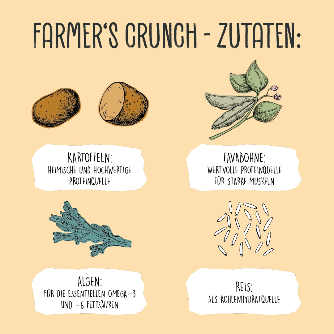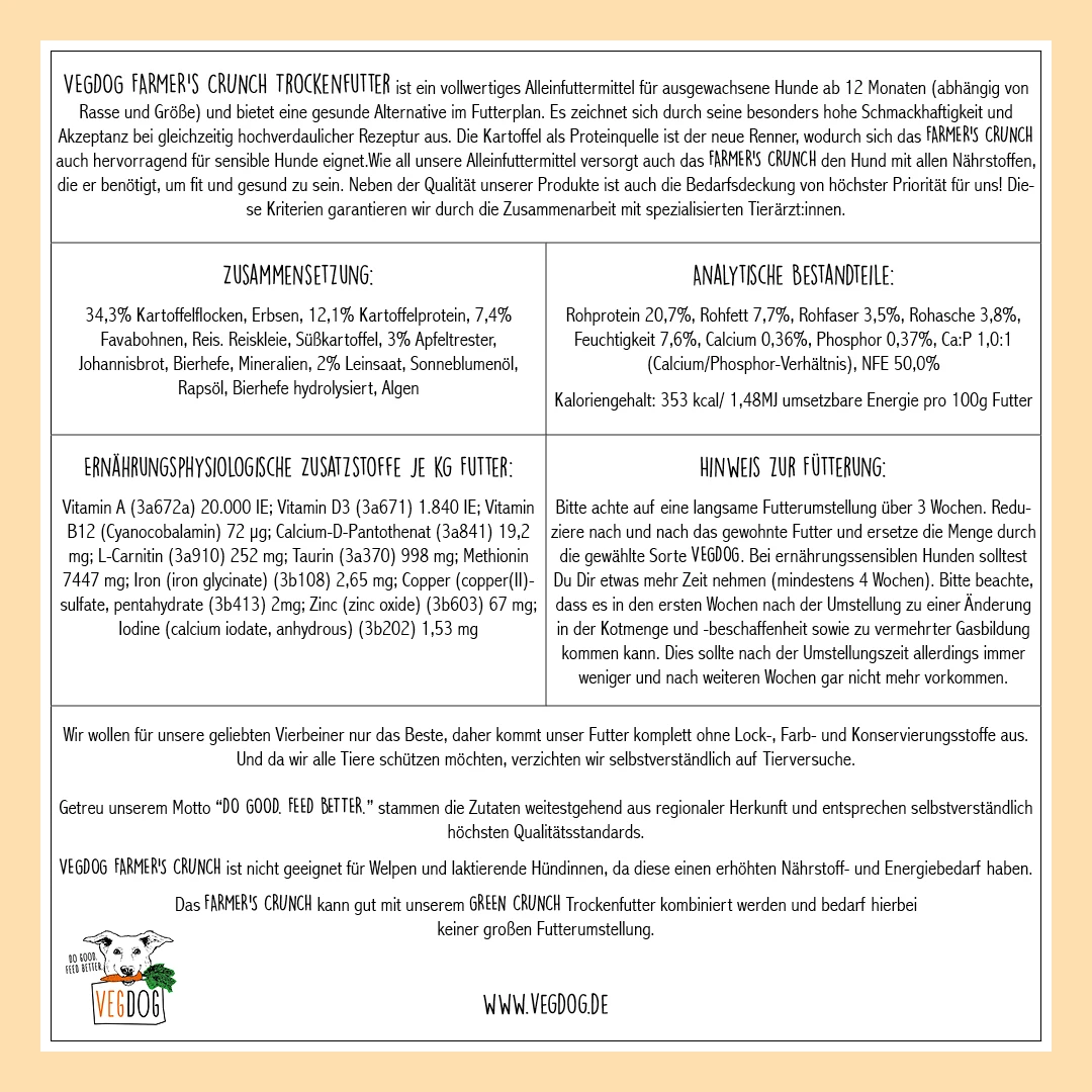Wenn Sie auf der Suche nach einer gesunden Alternative für den Speiseplan Ihres Hundes sind, ist VegDog Farmers Crunch eine gute Wahl! Es ist ein komplettes Trockenfutter für ausgewachsene Hunde ab 12 Monaten und zeichnet sich durch besonders hohe Schmackhaftigkeit und Akzeptanz aus. Das liegt an der leicht verdaulichen Rezeptur mit der Kartoffel als Eiweißquelle. Dadurch ist dieses Futter auch für empfindliche Hunde geeignet.