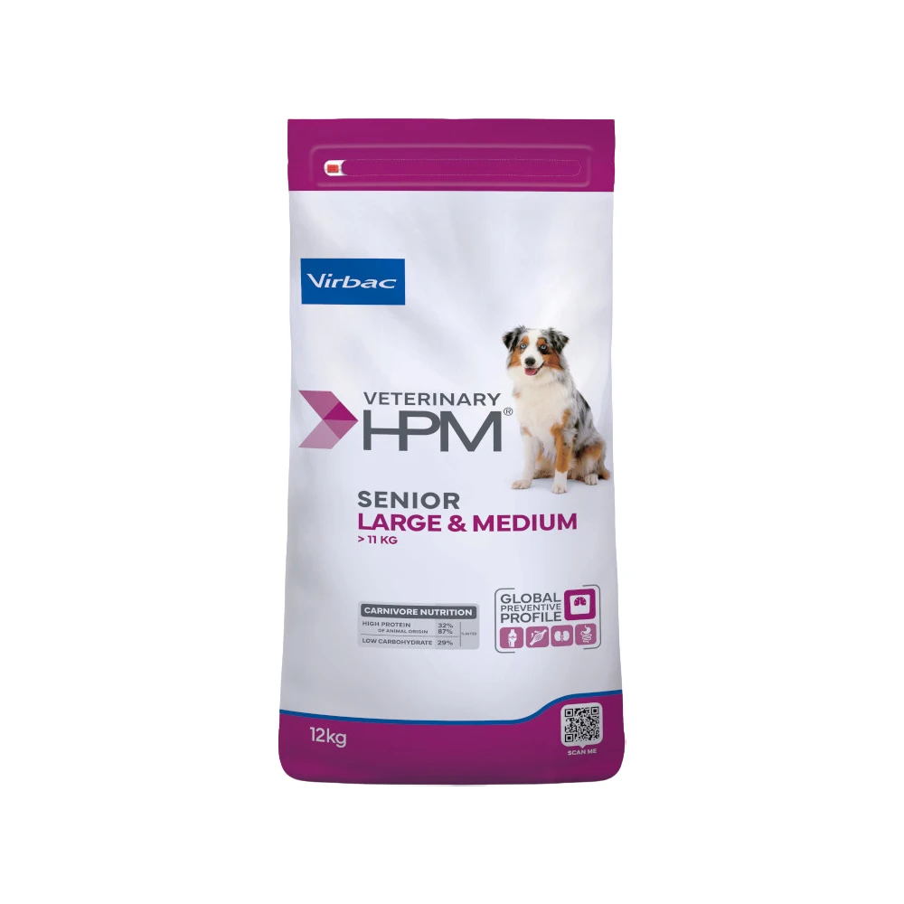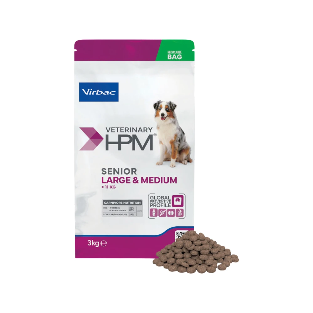 Senior Dog – Large & Medium aus der Produktlinie Virbac Veterinary HPM ist ein Alleinfuttermittel, das für ausgewachsene Hunde von großen Rassen ab einem Lebensalter von 6 Jahren geeignet ist. Die Zusammensetzung von dem Futter ist speziell auf die Bedürfnisse von den Hunden großer und mittelgroßer Rassen abgestimmt. Das neue Gesundheitsfutter basiert auf einer Formulierung mit einem niedrigen Kohlenhydratgehalt und hohen Proteingehalt. Die Reduzierung von Stärke und Kohlenhydraten, sowie die Erhöhung von tierischen Fetten bringen das Futter wieder zu den natürlichen Bedürfnissen von Fleischfressern zurück.